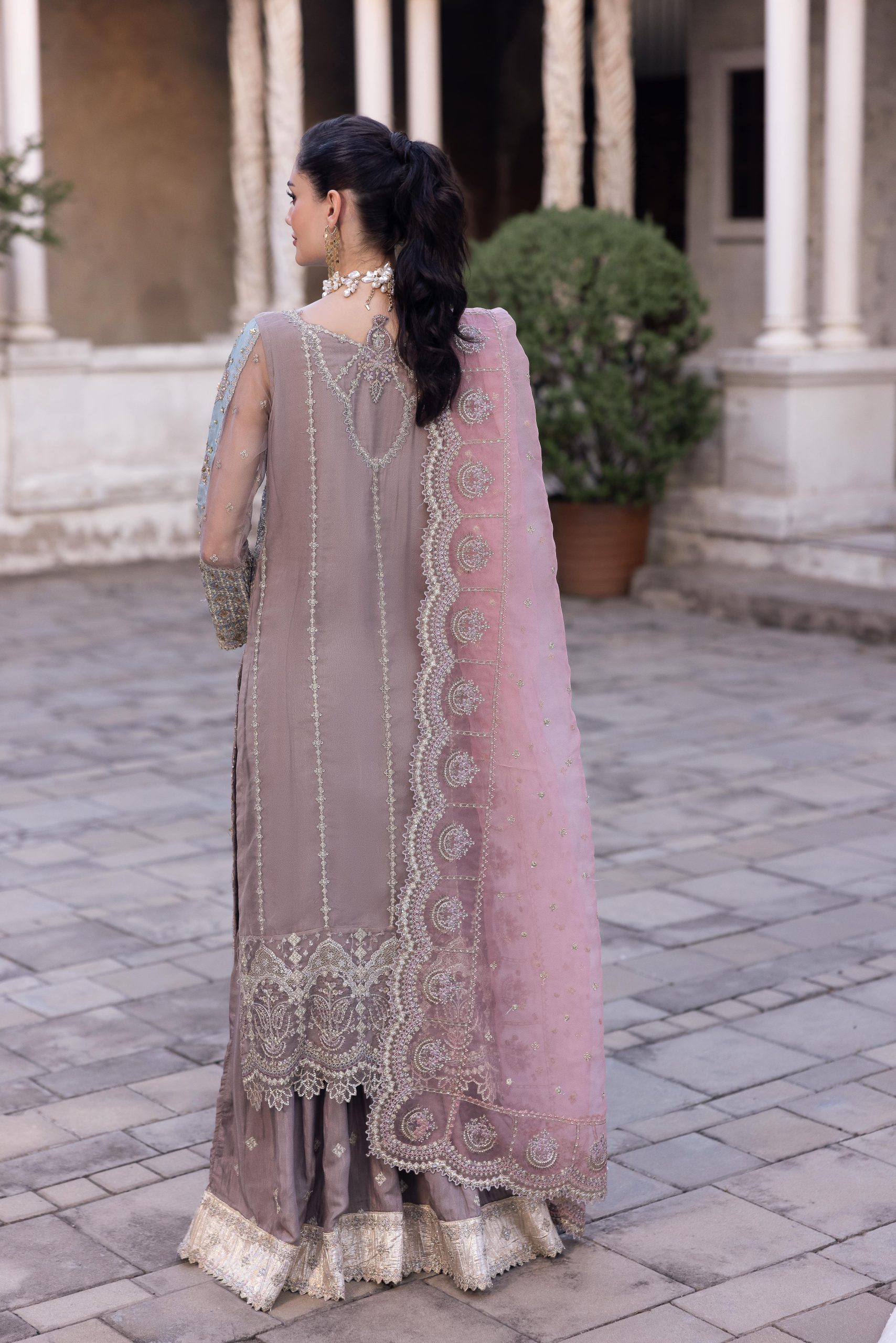 A poetic blend of soft pink hues, intricate handwork, and regal charm. This ensemble is designed for the modern muse who adores tradition wrapped in elegance.